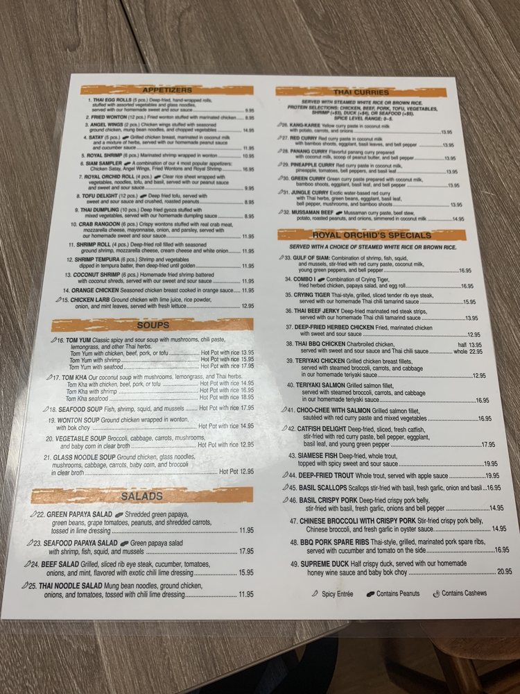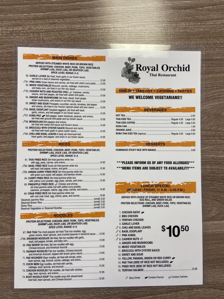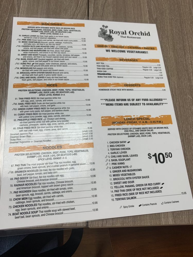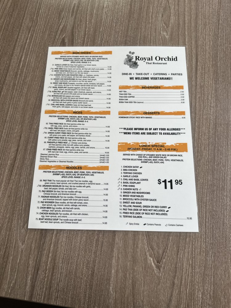 Many dishes come with vegan and vegetarian options, catering to diverse dietary preferences. Customers rave about the freshly prepared ingredients and vibrant flavors, perfect for lunch or dinner. With generous portions and friendly service, Royal Orchid Thai II stands as a beloved gem in the community, inviting you to savor each bite!